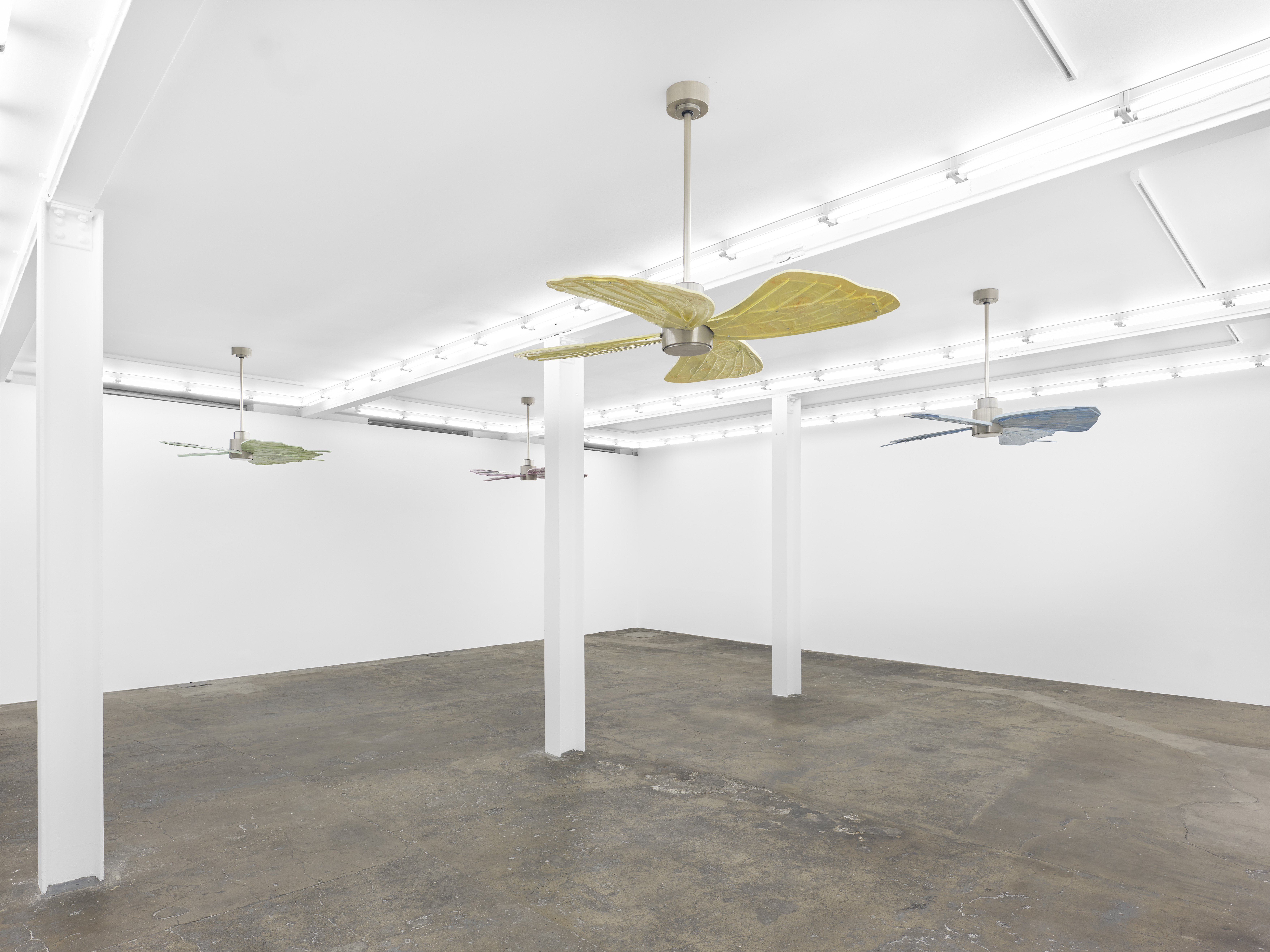 Olivia Erlanger continues her ongoing investigation into the history and semiotics of appliances with Fan Fiction, an exhibition of four ceiling-fan sculptures whose blades have been altered to resemble butterfly wings. In her practice, Erlanger has deconstructed the idea and function of appliances to demonstrate how their development has shaped suburbia, both internally and externally. These new works build on the artist’s interest in “closed worlds”, a term created by architectural theorist Lydia Kallipoliti for describing man-made, climate-controlled environments that exist to the detriment and obfuscation of an outside, so-called natural world.
