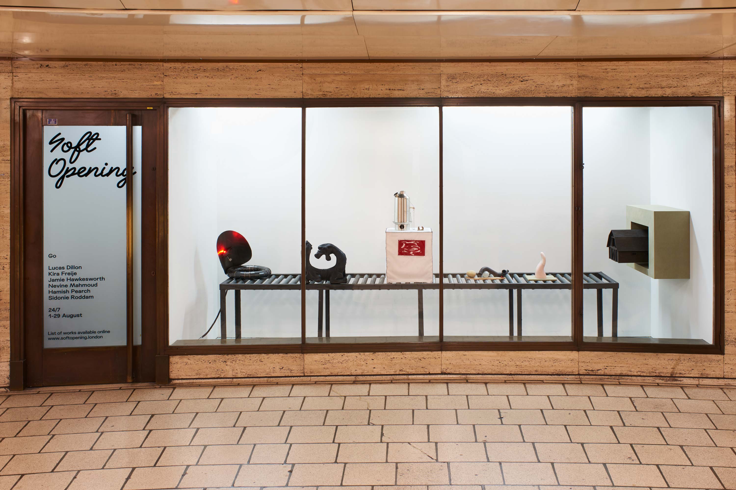 Go assembles a group of artists whose work investigates a reshaping of the world through a reconfiguration of materials, ideas and forms. Five objects are presented on cardboard rollers with portals at either end, suggesting a corridor that leads endlessly elsewhere. They better get there quick, before the cardboard buckles and the portals slam shut. In each sculpture, the principle of “truth to materials” reigns supreme: metal, found flotsam and jetsam, ceramic, stone or wood stand by their material idiosyncrasies. Whether in the delicate positioning of Hawkesworth’s balanced found objects, Freije’s cut and welded metalwork, or in Mahmoud’s carved and smoothly polished marble, each object represents human labour made material. Taking into account the cyclical subterranean architecture of Piccadilly Circus, Go considers what it means to be a unique but lumpen thing travelling through a conduit at speed.