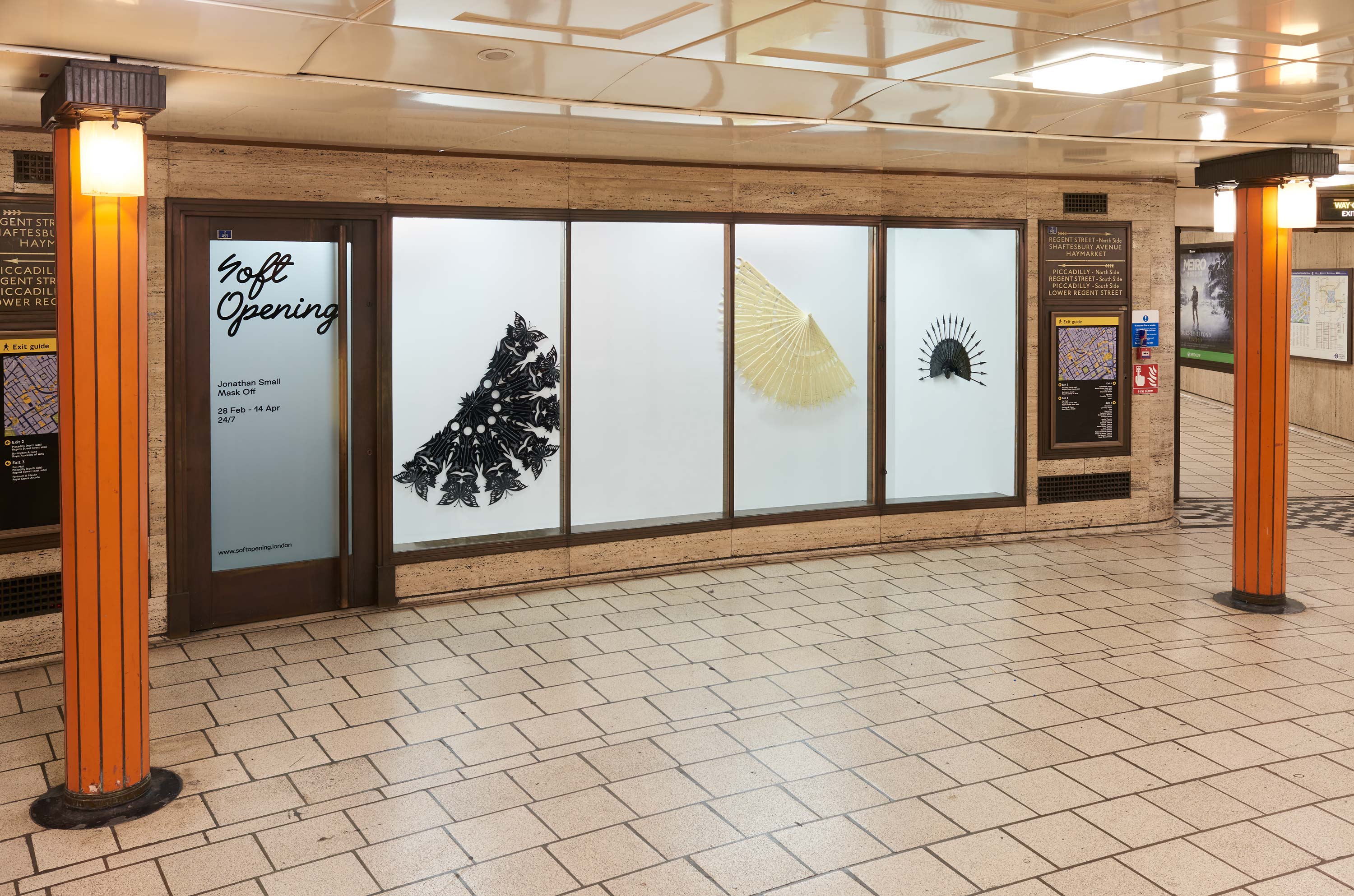 In a solo presentation from Jonathan Small, perspex fans cut with intricate patterning adorn the walls at Soft Opening’s Piccadilly Circus space. Engraved onto Small’s reimagined version of the folding fan, referencing his Japanese heritage, the artist depicts fantasy scenarios of desire, love and violence that otherwise might prove challenging to express. By covering the works in detailed engravings and cutouts, the fans display a complex, self-determined lattice of symbology. Used to convey hidden messages within their designs, ancient Japanese fans represent devices of communication used to hide one’s true emotion from society. Referencing myriad sources ranging from Western movie posters to biblical illustrations, textile patterns, Art Nouveau design and organic forms, while abstracted on single blades, once folded outwards the full engraved tableau becomes complete. Small’s sculptures become motifs of deception, markers of a human instinct to oscillate between hiding and revealing our own image.