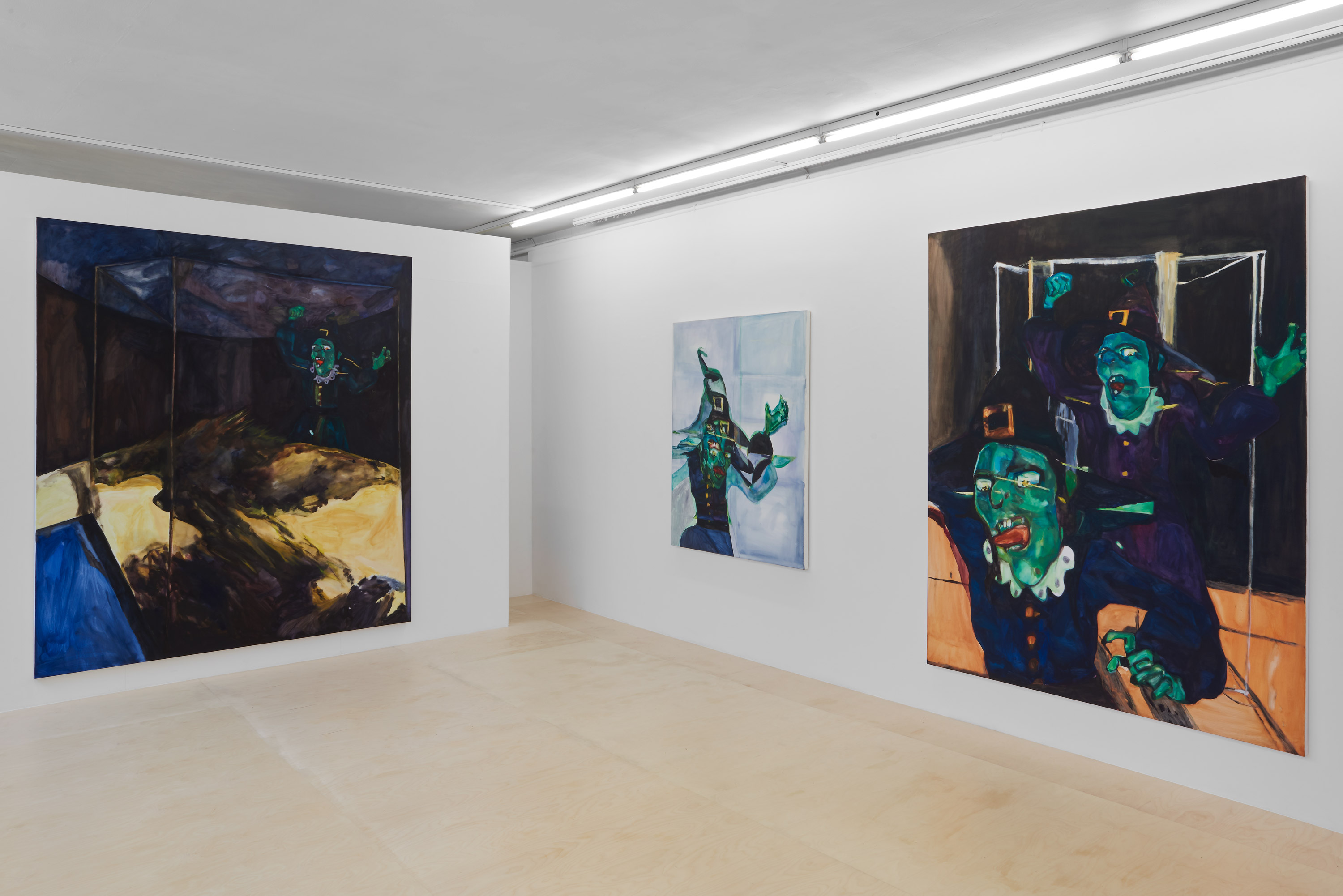 In Mostly Women, Sara Knowland presents three paintings, each depicting a green-faced witch in a state of motion, rushing through a half interior, half exterior landscape. Signifying a continuing interest in feminist voices, for Knowland, the figure of the witch proves useful in examining female-ness, its depiction and expression. The use of the humorous cartoon of the Wicked Witch of the West with her buckled hat, purplish clothing and emerald skin engages a universally recognisable motif of a shapeshifting figure that oscillates between good and evil, between human and creature, between male and female.