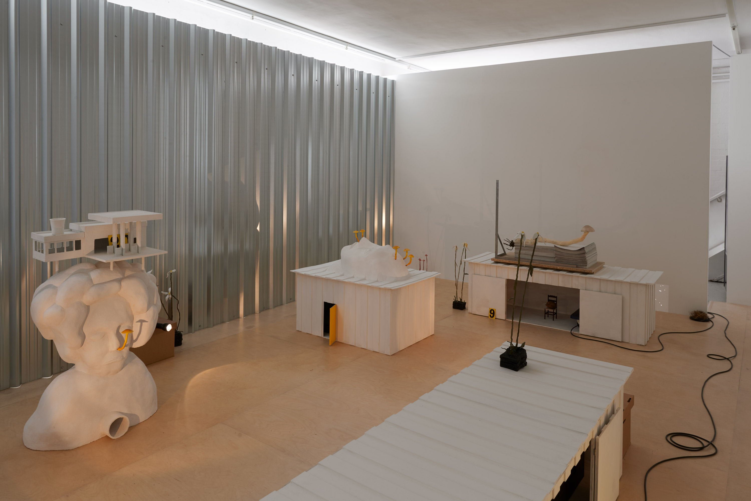 This room contains a family trip, someone dreaming of a petrol station, thinking architecture, blank newspapers, empty containers, obsolete carousels forever looping, exponential growth, dying daisies, security-guard torches, pyrotechnics on the edge of an island, moonlight blue, everywhere and everything, nowhere and nothing.