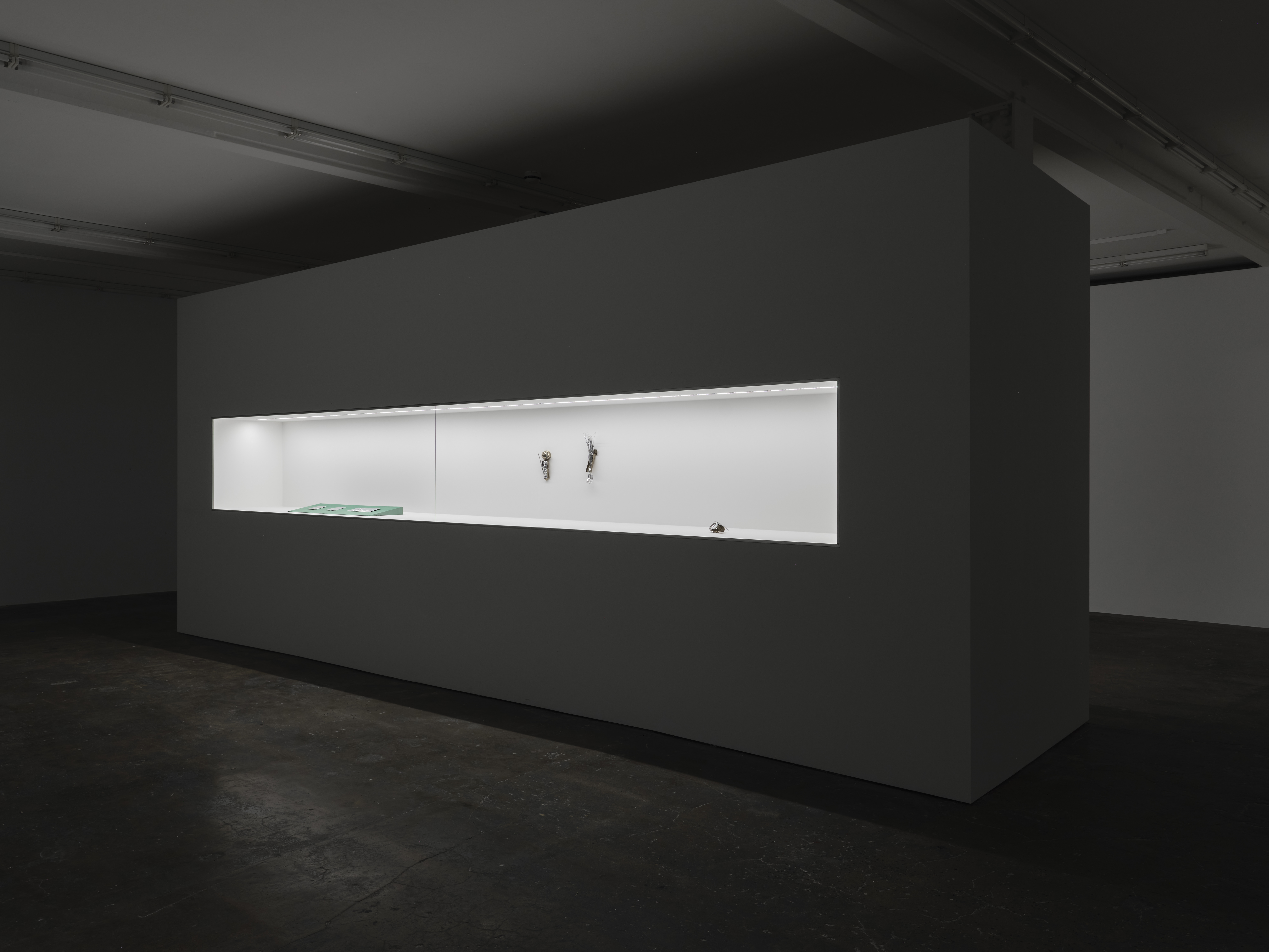 Burke’s process begins with what was initially an accidental adoption of a forbidden 17th century divination practice known as “Hydromancy”, involving the dispersal of molten wax into bodies of cold water, allowing unpredictable shapes and textures to form and be formed by their liquid surroundings. These initial water casts invariably become the starting point for Burke’s metallic sculptures, which in Oes with works like Esses, twinkle behind the glass of a monolithic, museological vitrine. This new group of works appropriate and combine historical craft techniques including model-making, carpentry, costuming, weaving basketry and jewelry-making. Moulding her intricate and precarious wax forms using these techniques prior to casting, Burke excavates and utilises processes and approaches from the past for their simplicity and primitive logic.