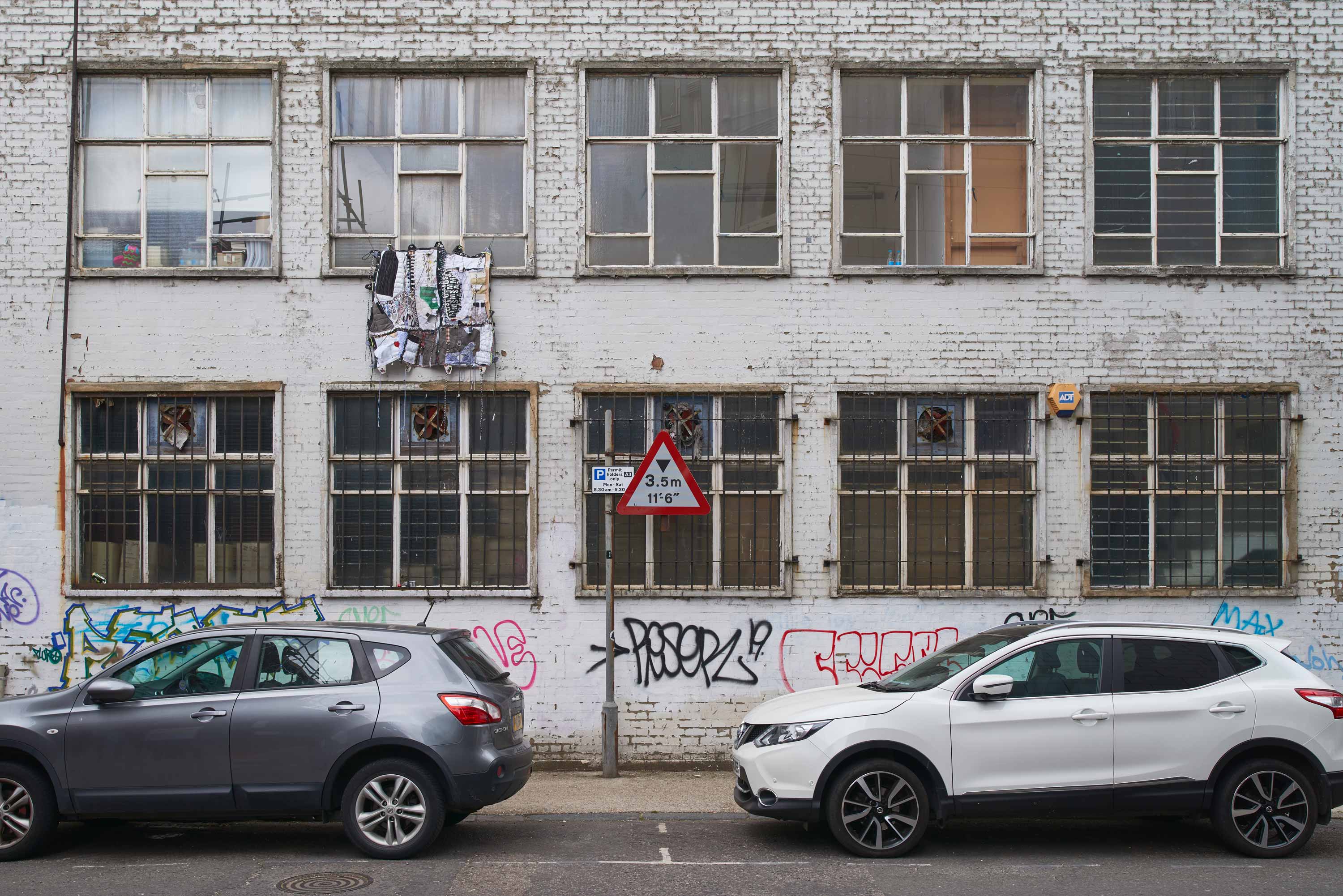 0.7 It reminds me of the porous sense of self that I experienced during quarantine. How the boundaries between the house, wardrobe and myself began to disintegrate. The amorphous piece resembles this feeling of disintegrating into your direct environment. The quilt, hanging from a construction in the windowsill of the building in Herald Street seems to morph into its environment almost seamlessly. After a few weeks of remaining outside, bleaching in the sun, getting stained by rain and smog, the piece will blend in even more. I wonder if we will forget to deinstall it, having become indistinguishable from the fabric of the street.