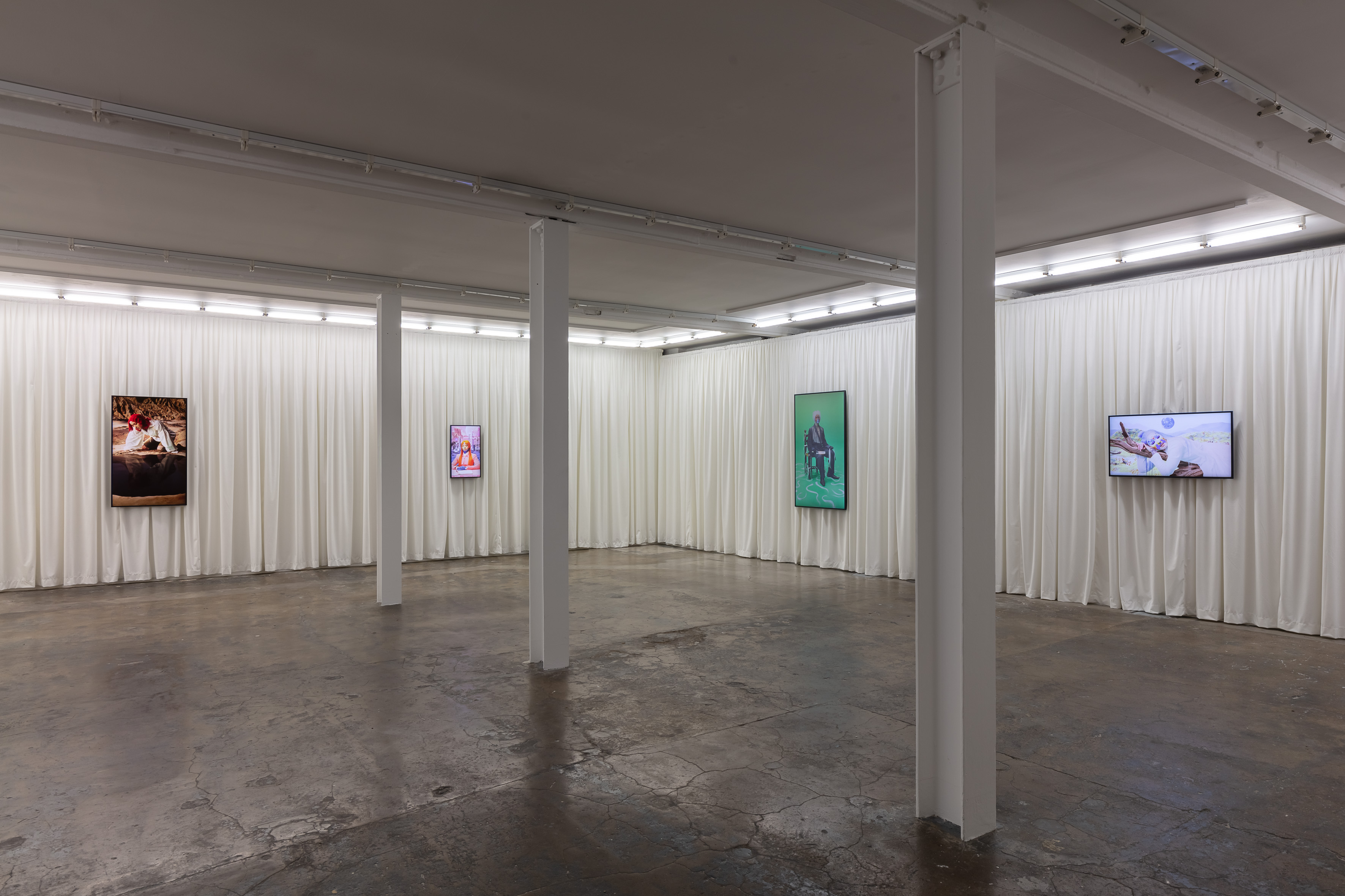 Theatricising the walls of the gallery, softly folded and flowing white velvet curtains run across all three walls of Portraits from floor to ceiling. Displayed in front of this, each of these new silent films loops continuously. The gesture of lifting screens onto the walls situates them within a lineage of painting, thereby historicising new narratives and identities via a continually expanding and developing cast of characters. The films themselves each reference a famous artwork from history, including Man Ray, Kiki with African Mask (1926); Caravaggio, Narcissus (1597–1599), Frida Kahlo, Self-Portrait with Cropped Hair (1940); Leonardo da Vinci, Mona Lisa (1503) and Lu Zhi, Chuang Tzu Dreaming Of A Butterfly (Ming Dynasty). Inserting their characters into an art historical lineage allows Sin to self-historicise their own practice while interrogating the positionality of the storyteller as a creator of histories. By blurring the boundaries of fantasy and reality in this way, the artist seeks to challenge the hegemonic narratives of history and asserts that image-making offers both the representation and creation of reality.