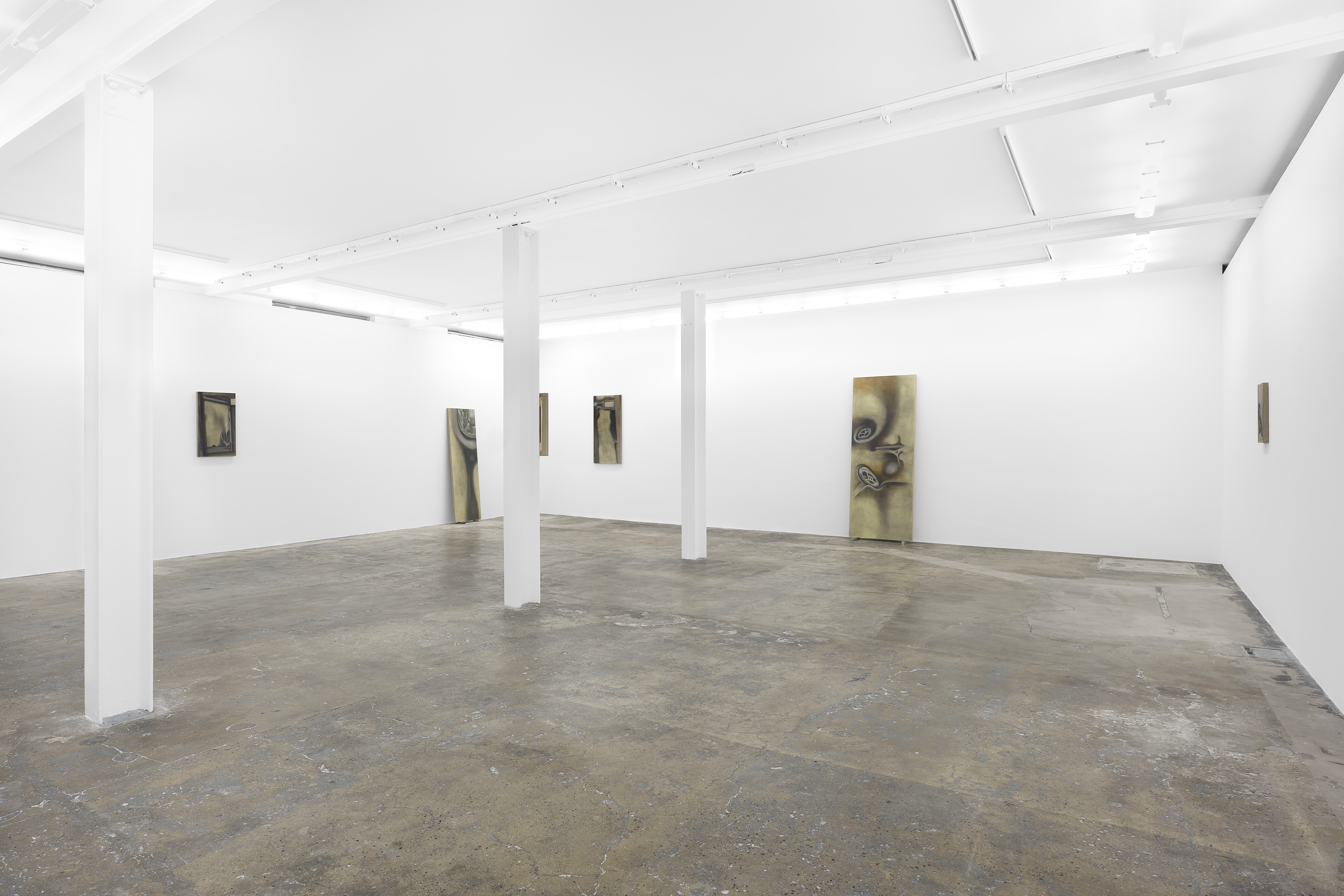 Last year, Maren Karlson began working with four photographs taken inside Kombinat VEB Chemische Werke Buna in the 1970s and 80s, a factory in Schkopau, East Germany that produced rubber and plastic. The photos show the decaying interior of the factory while it was still operational: a rotting floor, an eroding ceiling about to collapse, twisted pipes and a hole in the ground. The state-owned factory would continue to operate until the fall of the Berlin Wall and its eventual privatisation in the mid 1990s. Today, the factory is owned by the American company Dow Chemicals, one of the largest chemical producers in the world. At the factory, the water used for the internal processes is taken from the nearby Saale river, subjected to various chemical processes and eventually returned to the river, to be used by another factory downstream, where the cycle begins again. As a result of this consistent usage, the water between the factories slowly heats up. Karlson understands this overheating of water as an insurgence: no longer serving its intended purpose within the factory, the water rises up from within and can no longer be controlled, burning through the system that contains it. The transformative role of this water, its changing states within the production cycle of the factory and its eventual perceived insurrection, inform the logic of Karlson’s nine new paintings in Staub (Störung).