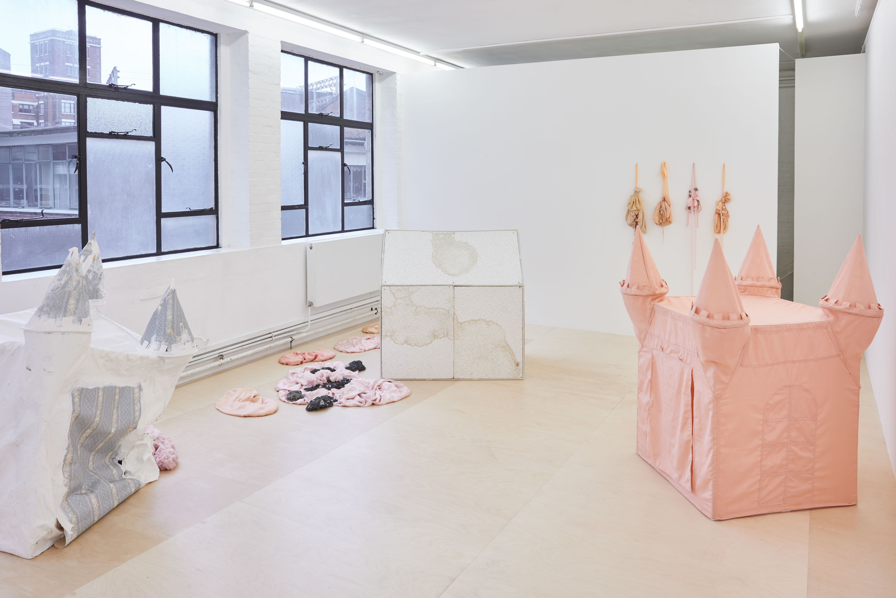 Topographical interventions made from found silk and halite crystals mined by Chiara herself accompany three of Vernet’s miniaturised architectural constructions. Based on children’s play tents, these sculptures resemble fairytale castles and the most simplified, characteristic family home. Whether in structures built specifically for indoor spaces, or fragments unearthed from the ground, both artists envision landscape through the lens of the interior.