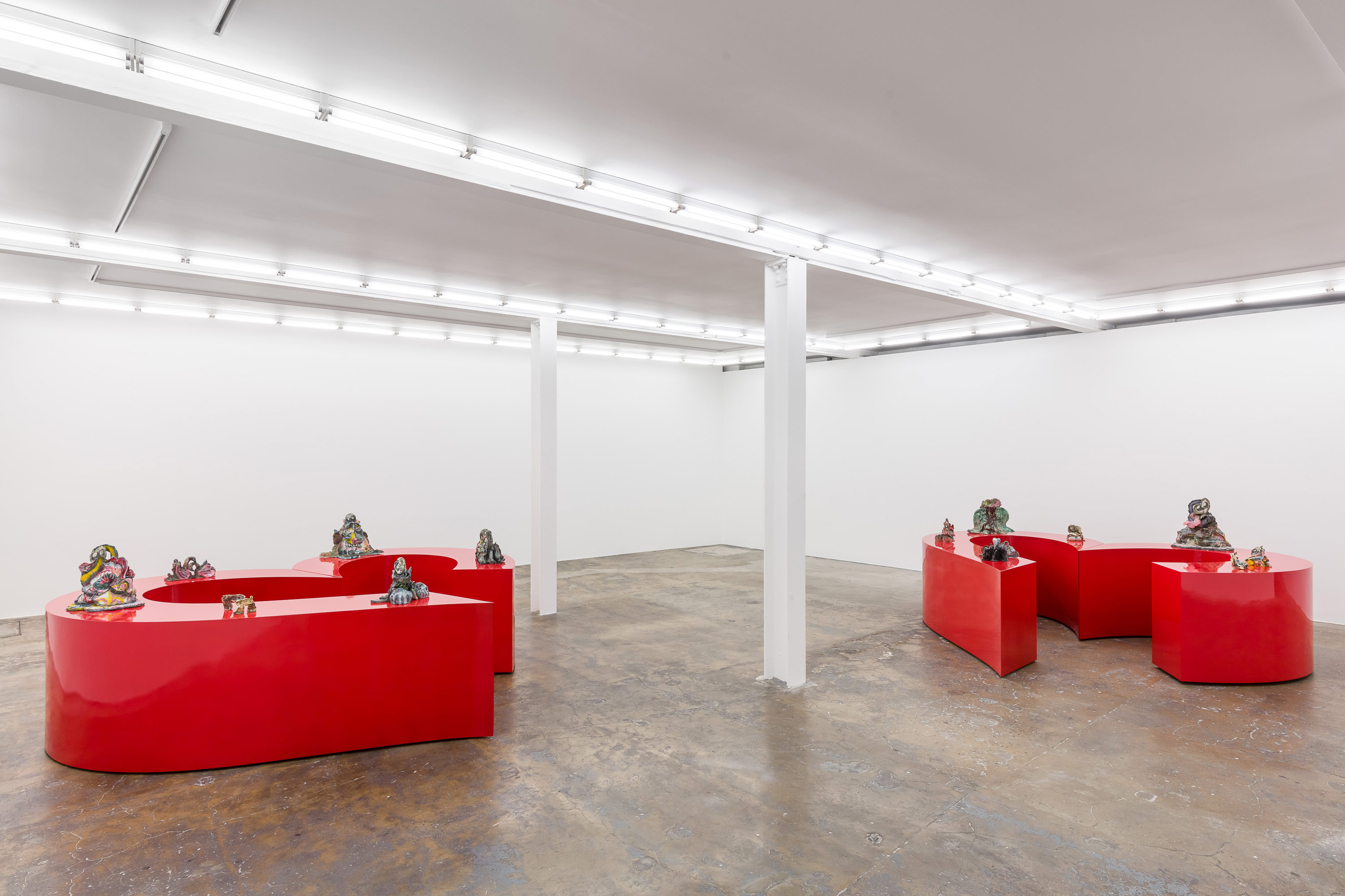 Positioned atop a pair of glossy red heart-shaped plinths, Narumi Nekpenekpen’s complex figures and creatures appear frozen in states of feeling, with their clompy feet and oversized doe-shaped eyes peeking out from a whirl of colour, shape and texture. Nekpenekpen’s work involves and processes her emotions within an alternative subconscious, where layers of porcelain and glaze represent thoughts and memories. A reflection of her often indefinable innermost conflicts, in where you fit in my palm, clay becomes a translator for grief, fear, pain, hope, joy, love and desire. By projecting her emotional state onto her sculptures in both their material construction and frenzied glazing techniques, Nekpenekpen externalises the confusion of her internal world in a courageous approach to self-portraiture.