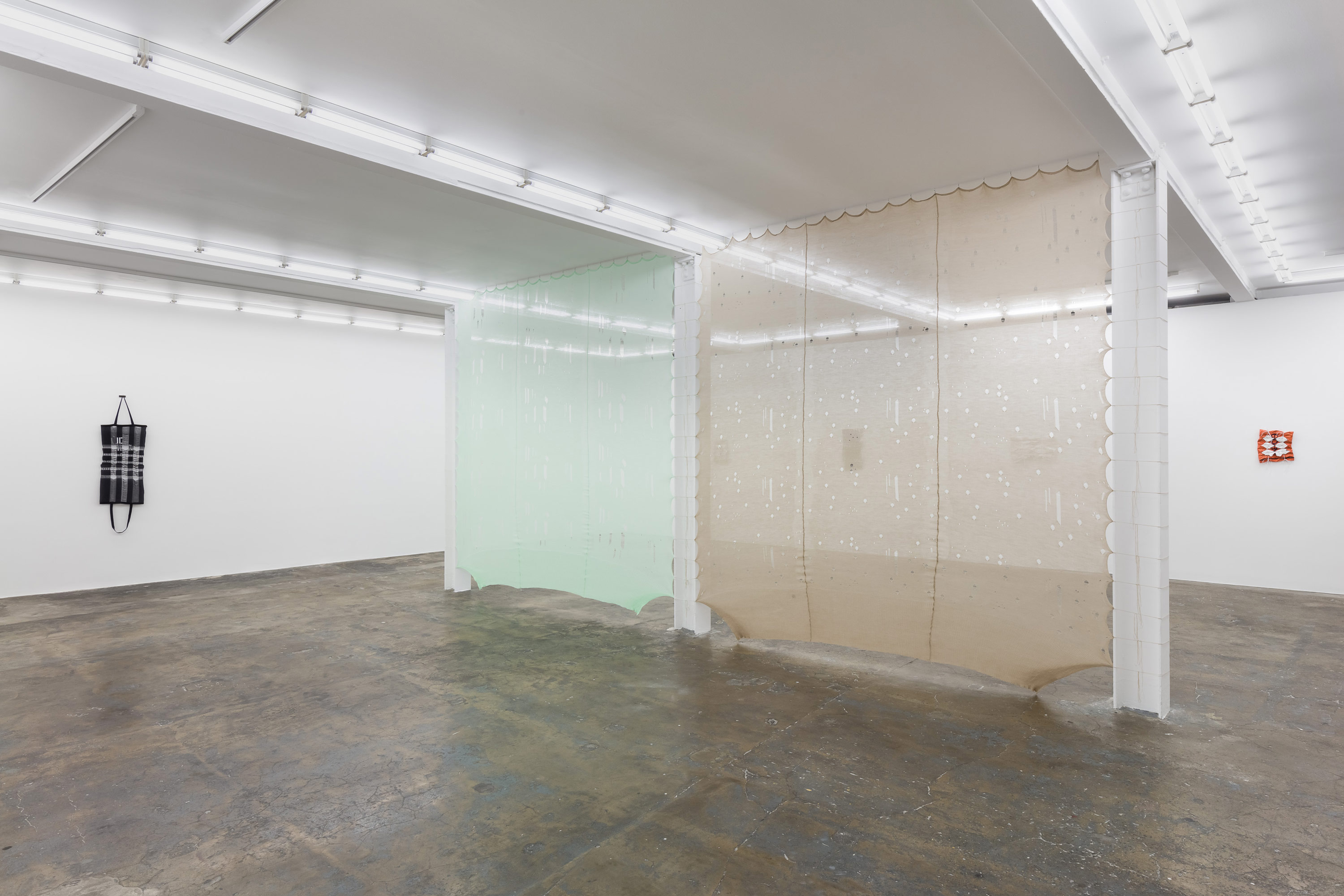 In Sabotage in Acrylic (mint) and Sabotage in Acrylic (taupe), large panels of knitted fabric stretch between architectural features of the gallery. The word sabotage derives from the French word saboteur originally used to refer to labour disputes in which workers wearing wooden shoes called sabots interrupted production through different tactics, including the destruction of means of fabrication. These large-scale site-specific works simultaneously reference a renowned jumper designed by Rei Kawakubo for Comme des Garçons in the late 1980s, for which Kawakubo intentionally sabotaged knitting machines to create gaping holes. Made by a similar machine pre-programmed to introduce areas of faux damage, Tenant of Culture decorates the knitted panels with a pattern of various standardised holes and ladders. The Sabotage in Acrylic works therefore point at once to the historical tactic of sabotaging machinery as a way to negotiate labour conditions, as well as the process of the mass production and consumption of damage as a stylistic feature in the clothes we wear.